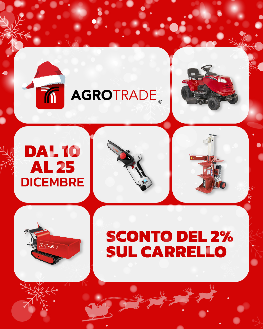 10 Dicembre 2025Dal 10 al 25 dicembre, Agrotrade lancia una promozione esclusiva con sconto del 2% automatico al carrello su tutte le attrezzature professionali. Il momento perfetto per equipaggiare la tua attività con macchine di alta gamma, selezionate tra i migliori produttori mondiali.
