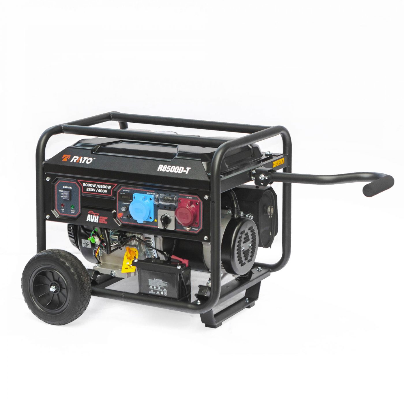 Gruppo elettrogeno monofase Rato R8500D-T capace di generare corrente elettrica fino ad una potenza massima di 8.5 kW grazie all’affidabile motore a scoppio Rato R500 da 500 cc di cilindrata e capace di erogare una potenza di 13 Hp.